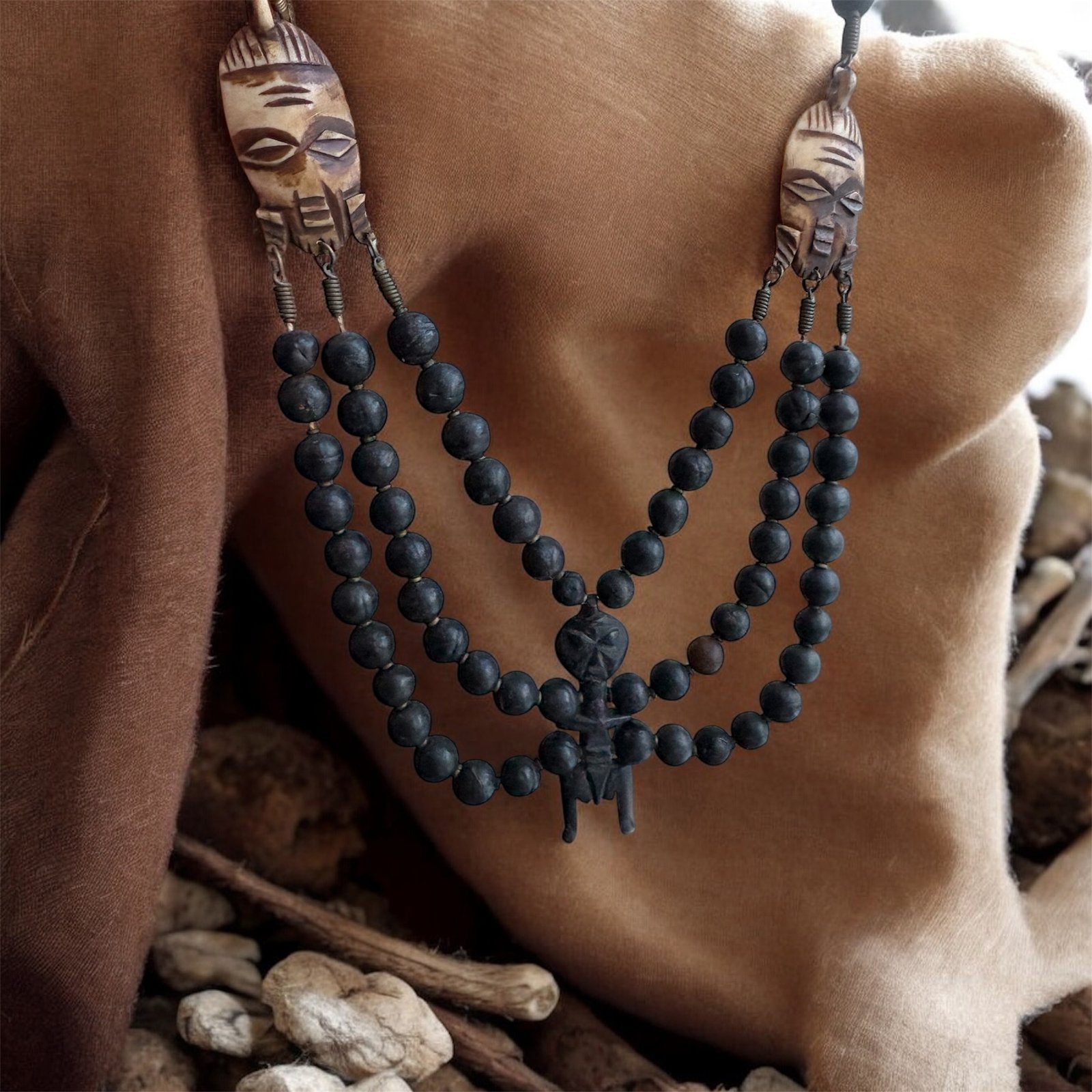 This necklace is a devotion to the African diaspora and the spirits who walk between worlds those who bridge earth and death, memory and becoming. It honors ancestral presence as something living, guiding, and intimate. Worn close to the heart, it serves as a reminder that we are never alone; we are carried by voices older than time, moving through us as protection, wisdom, and continuity.