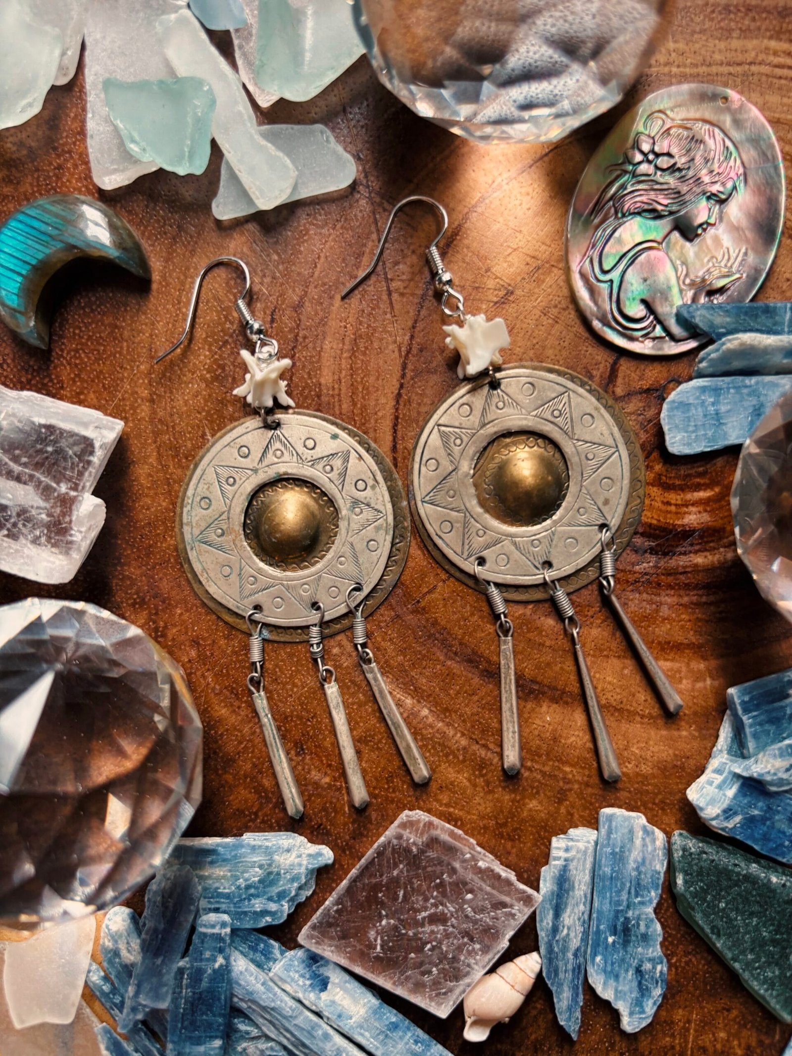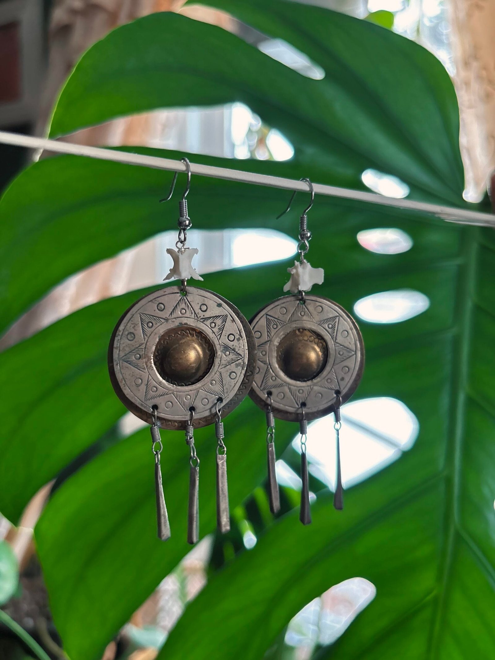 “I Am The Sun” Snake Vertebrae Earrings are a tribute to the change of season. The moment the dark half of the year takes over and covers the sun in a cloak of darkness. Complete with ethically sourced snake vertebrae found right on our farm!
