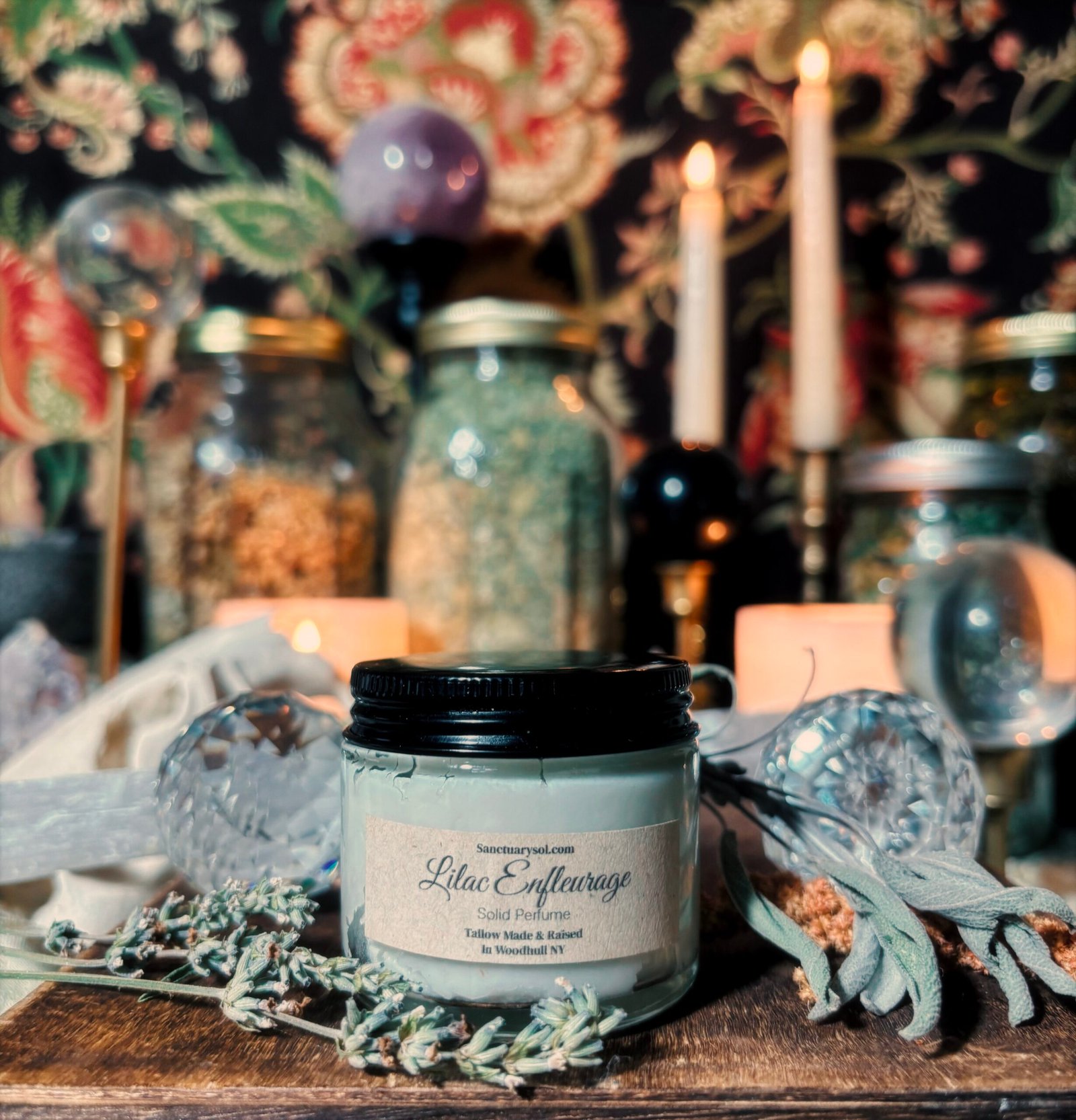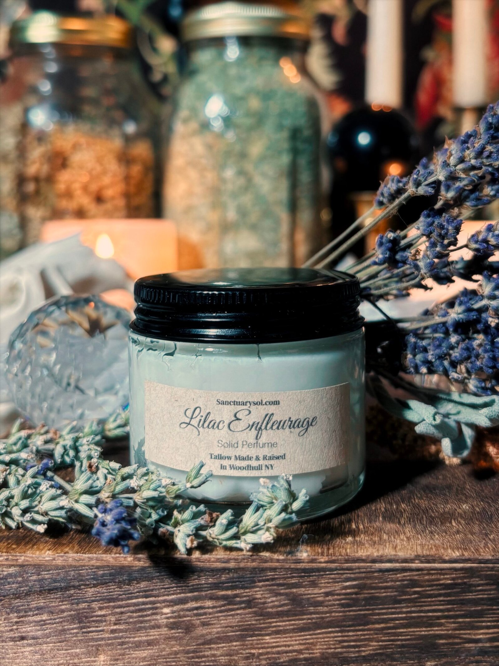 Lilac Enfleurage is a solid perfume made through the labor intensive process of cold enfleurage to bring you the true scent of the living fragrant flower. We hand pick our lilac buds for roughly 36 days and press them into 100% beef tallow, changing the buds every 24 hours. Moisturizing and aromatic our enfleurage will delight your senses and remind you of warmer brighter days through the winter months.